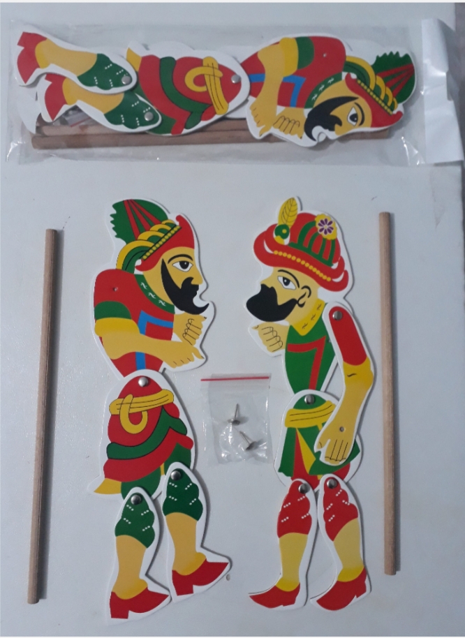 Kalın renkli mukavvadan imal edilmiş. Üzeri parlak selefonlu. Ahşap oynatma çubukları ve Hacivat ve Karagöz karakteri.